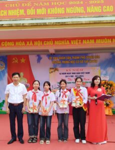 Một trong những giây phút lắng đọng của buổi lễ là phần phát biểu tri ân và trao tặng những bó hoa tươi thắm từ Ban đại diện cha mẹ học sinh phụ huynh và các em học sinh. Bạn Đoàn diệp Chi – học sinh lớp 9A đại diện học sinh toàn trường đã bày tỏ lòng biết ơn sâu sắc qua những lời tri ân xúc động: “Thầy cô không chỉ là người dạy chúng em kiến thức mà còn là người định hướng và chắp cánh cho những ước mơ. 20/11 là dịp đặc biệt để chúng em bày tỏ lòng biết ơn sâu sắc đối với những người dành cả tâm huyết để truyền đạt kiến thức, bồi dưỡng nhân cách cho chúng em. Em đại diện cho 562 bạn học sinh trong trường kính chúc thầy cô giáo luôn mạnh khỏe, hạnh phúc và thành công trong sự nghiệp trồng người”